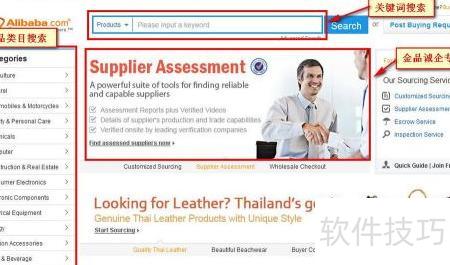 1、 买家在网页上的搜索方式主要有三类:通过产品类目、关键词以及金品诚企专区进行查找。
