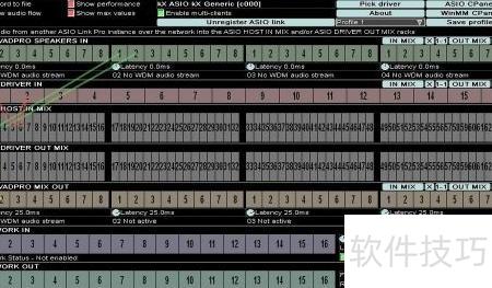 3、 打开ASIO跳线界面后,将1+2端口连接至第二排的3+4端口,表示播放器音频通过SAM机架的3+4通道输入;同时将硬件麦克风的1号接口连接到第二排的5+6端口,说明福克斯特麦克风1号接口接入SAM机架的5+6输入通道。理解信号传输原理后,可根据实际需求灵活调整连线方式,该工具支持多种配置方案,使用方式多样,适应不同场景需求。