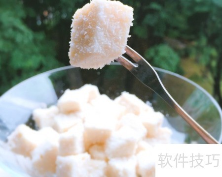 12、 将温水冲调好的优天力小骨励营养包与适量玉米淀粉混合,充分搅拌均匀。倒入锅中,以小火加热,持续搅拌至呈浓稠糊状。倒入容器,放入冰箱冷冻2至3小时,待其凝固成型后取出,切成大小一致的小方块,再均匀裹上一层椰蓉即可食用。