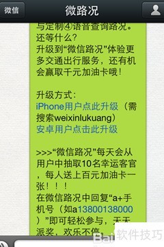 1、 在微信中搜索并关注微路况公众号,按提示操作即可升级为微信路况。