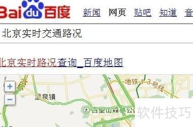 3、 在百度搜索栏输入XX实时交通路况,点击查询,排名第一的结果为百度地图提供的实时路况信息。通过查看地图上道路显示的颜色——红色、黄色或绿色,便可判断当前路段的拥堵程度,颜色不同代表通行状况各异。