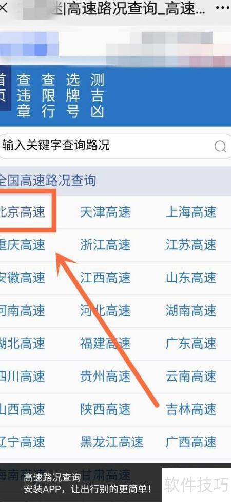 6、 进入高速路况查询页面后,点击欲查看的路段,以北京为例进行选择,具体操作所示。