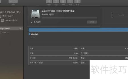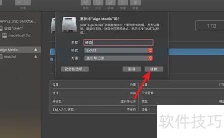 在Air上将移动硬盘格式化为exFAT,可通过磁盘工具选择硬盘,设定格式为exFAT后进行抹掉操作即可完成。