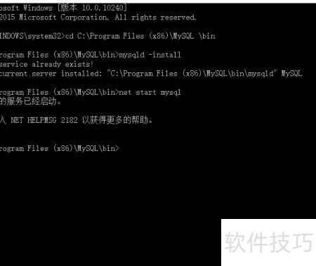 12、 MySQL服务已成功启动。所示,由于此前已完成配置,系统提示服务已存在。