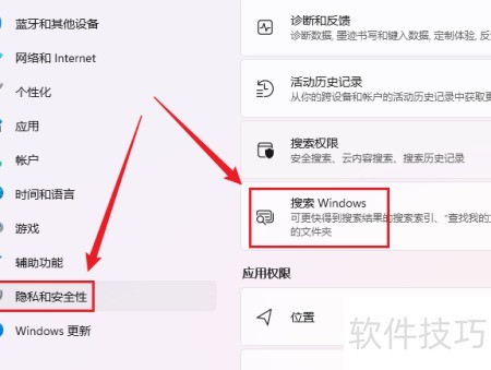 2、 在左侧选隐私与安全,右侧输入搜索Windows内容。
