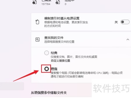 Windows 11默认以经典模式搜索文件,仅限文档、图片、音乐及桌面内容。启用增强模式后,可全面搜索整个系统,操作步骤如下: