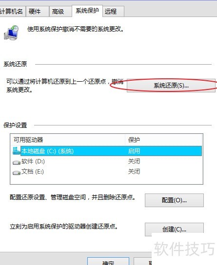 4、 顶部有系统还原选项,点击更改设置即可操作。