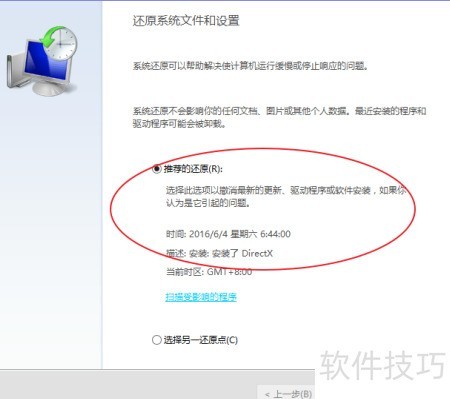 5、 系统会建议恢复至最近一次程序修改的状态,点击还原后,电脑将回到使用该软件前的原有状态。