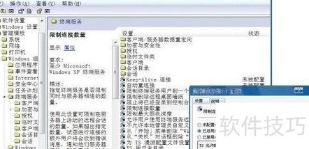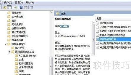 6、 进入组策略,依次展开计算机配置、管理模板、Windows组件、远程桌面服务,将限制连接数量设置为启用,并将最大连接数调整为50。