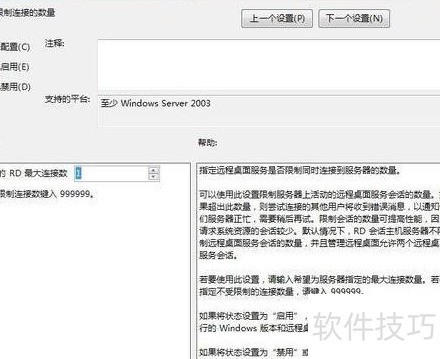 10、 在组策略中依次展开计算机配置、管理模板、Windows组件和远程桌面服务,将限制连接数量设置为启用,并将最大连接数调整为50。