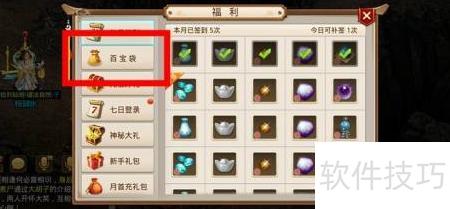 2、 在百宝袋界面中,陈列着丰富多样的道具与礼品,玩家可随机获取其中物品。