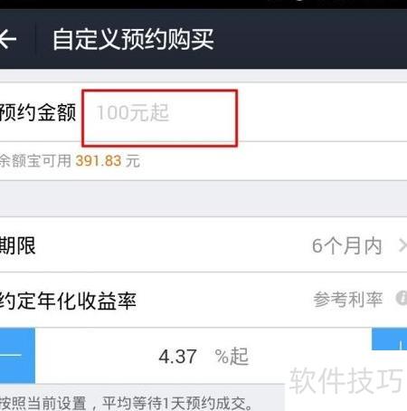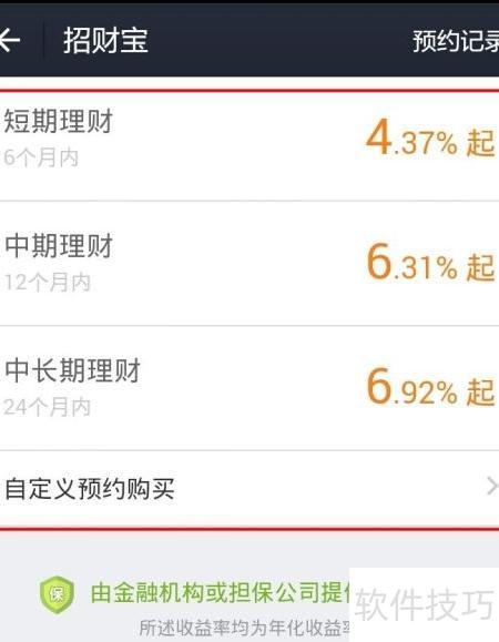 6、 进入招财宝收益页面后,可见短期、中期及中长期各类利率选项。用户可选择自定义预约购买功能,接下来将以该功能为例进行操作演示,请点击自定义预约购买开始设置。