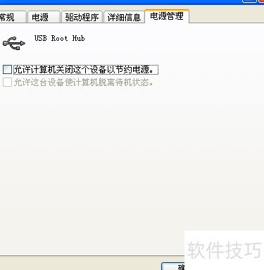 4、 右键点击USB ROOT HUB属性,进入电源管理选项卡,取消勾选第一个选项,最后确认并退出设置界面。