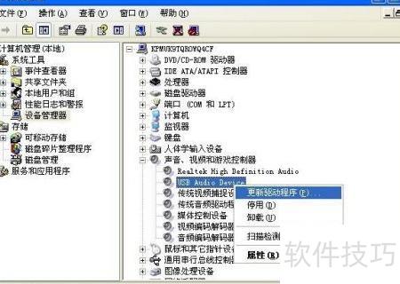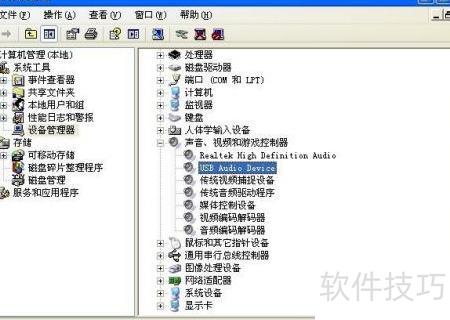 3、 打开设备管理器,展开声音、视频和游戏控制器,找到USB音频设备后,右键点击进行操作。