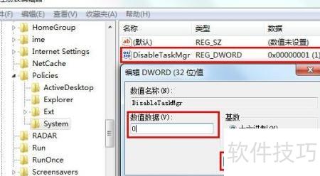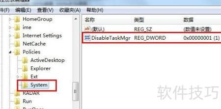 7、 依次展开注册表路径HKEY_CURRENT_USERSoftwareMicrosoftWindowsCurrentVersionPoliciesSystem,在右侧窗口中可找到名为DisableTaskMgr的项,该条目用于控制任务管理器的启用或禁用状态,修改其数值可开启或关闭任务管理器功能。
