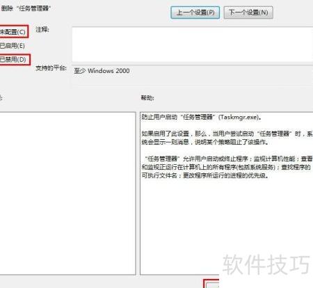 5、 右键点击任务管理器删除选项,选择编辑,将右上角设置为未配置或已禁用即可完成操作。