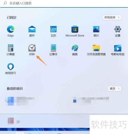1、 点击开始按钮,打开开始菜单,选择时钟图标即可查看。