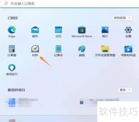 1、 先开电脑,点开始菜单,进入后选择时钟选项。