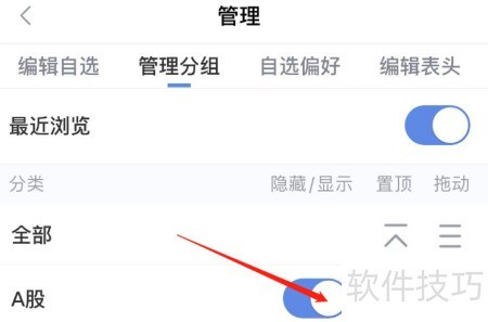 4、 第四步,在自选偏好中点击关闭管理分组里的,即可隐藏新浪财经的A股信息。