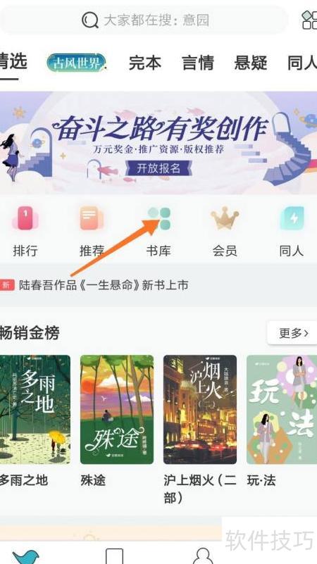 2、 进入原创页面后,点击顶部书库按钮。