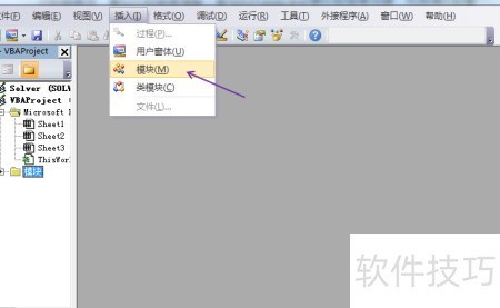 2、 在VBA编辑器菜单栏中依次选择插入和模块。