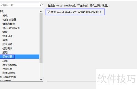 3、 在弹出窗口中定位到同步设置,取消勾选登录Visual Studio时同步设备间设置即可完成操作。