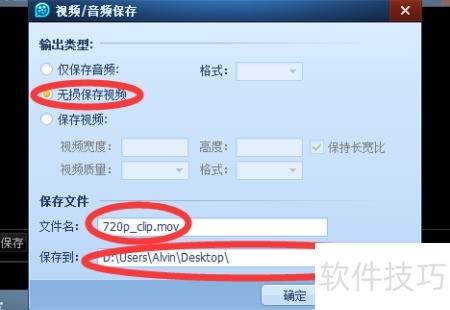 5、 确认截取无误后点击保存,选择无损保存视频选项,输入文件名,设置保存路径,完成操作。