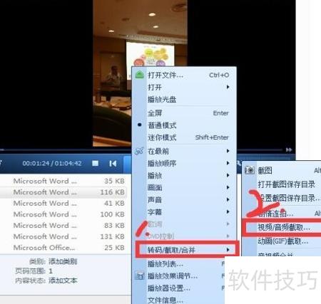 1、 使用QQ影音打开视频,右键点击播放画面,选择转码/截屏/合并中的视频/音频截取功能,操作后播放状态将2所示发生变化。