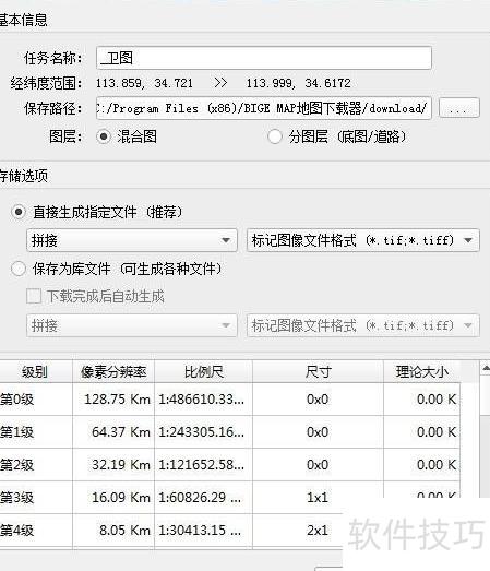 7、 双击鼠标会弹出对话框,可设置下载名称、保存路径、图像格式及级别。注意15级以上时,自然村名称将不再显示。