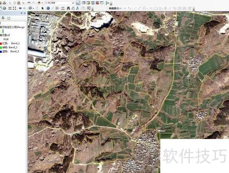 21、 在ArcMap中载入已正射校正的数据,叠加林业矢量图层,参照外业绘制的边界,将影像与矢量数据对齐,精确矢量化至林业图层,确保边界与影像一致,所示。