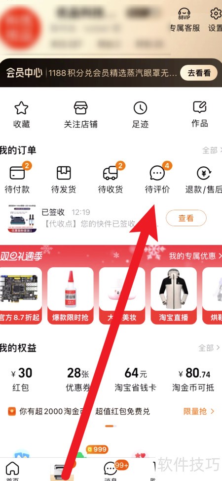 1、 进入淘宝个人页面,点击顶部的待评价订单。