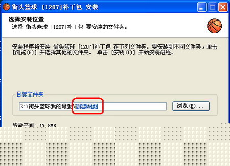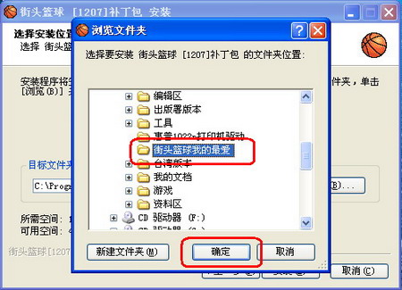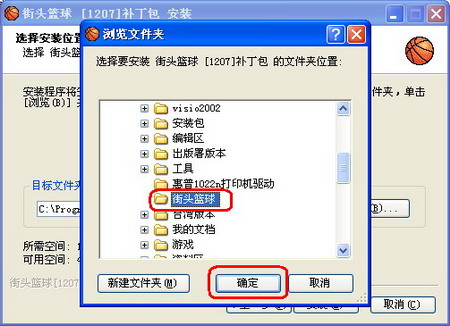 4、点击“浏览”,选择街头篮球安装目录文件夹。如果“街头篮球”文件夹名字未被更改,您会看到名字为“街头篮球”的文件夹。如图。
