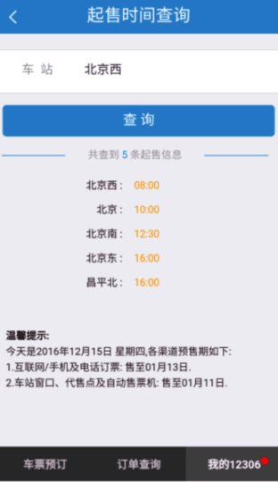 虽然从早上6点,小伙伴们就可以抢票了,但需要注意的是,铁路部门在8:00—18:00期间的整点和半点都有新的列车开售,出发车站不同,起售时间也不同。以北京为例,北京西站出发车次起售时间为8:00,北京站起售时间为10:00,北京南站出发车次起售时间则为12:30。目前,乘客可以登录12306网站或使用铁路12306 APP,查询火车站的起售时间。