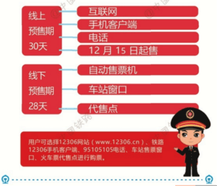 一般情况下,乘客可以选择互联网、购票APP进行网上抢票,或通过电话购票,亲自到售票处买票。春运期间,互联网、电话购票预售期为30天,而售票处、代售点预售期为28天。12月15日,春运第一天的火车票已经开售,没有抢到票的乘客,可以在17日到售票处和代售点购买2017年1月13日的火车票。