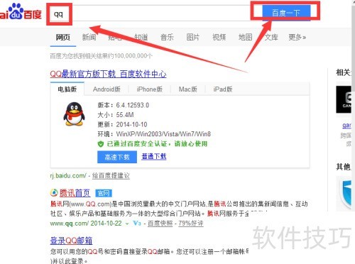 1、 打开浏览器,进入百度,输入qq后点击搜索。