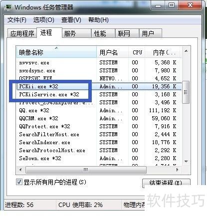 1、 同时按下Ctrl+Alt+Delete键启动任务管理器,结束名称以PCKii开头的两个进程。