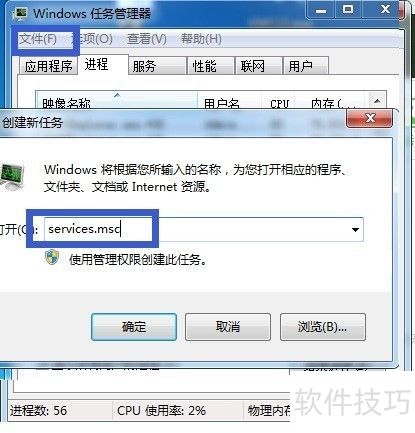 2、 接着,在任务管理器的文件菜单里选择新建任务,于弹出对话框输入services.msc,点击确定或按回车键。