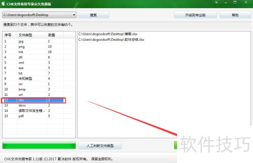4、 当文件类型显示为docx/mp3/xlsx等时,先在软件左侧选择一个文件类型,接着从右侧文件列表中选取一个文件,再点击按钮。需要注意的是,试用版软件每次仅能恢复一个文件,而正式版软件则可使用功能。
