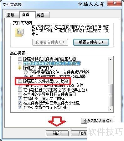 4、 取消隐藏已知文件类型扩展名勾选,然后确认。