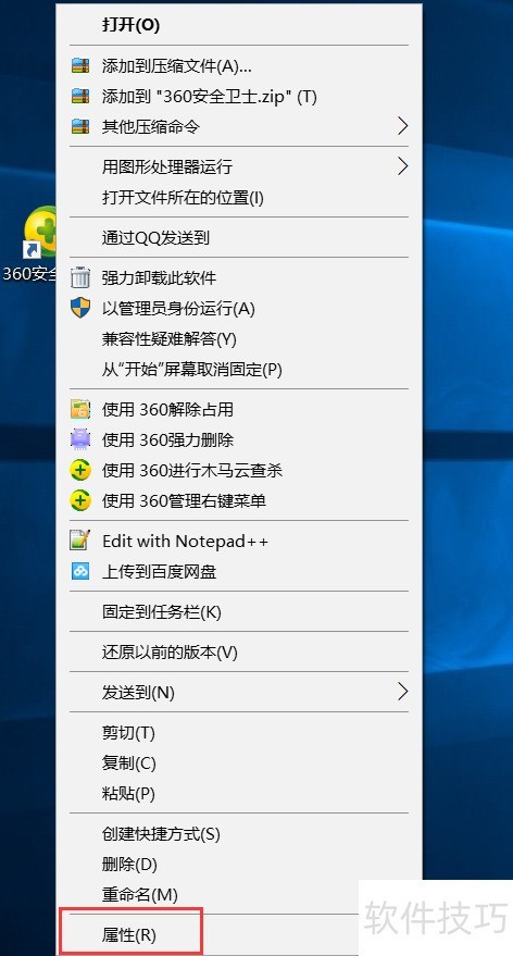 4、 要删除急救箱,先查看360卫士安装在哪个盘。右键单击其图标,选择属性打开。