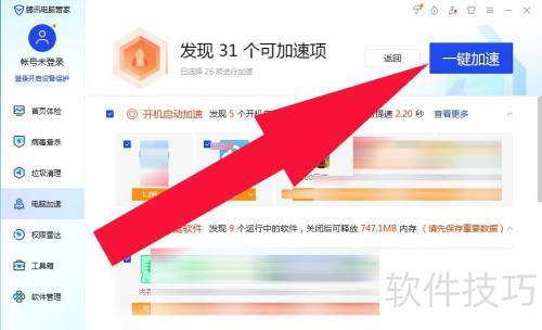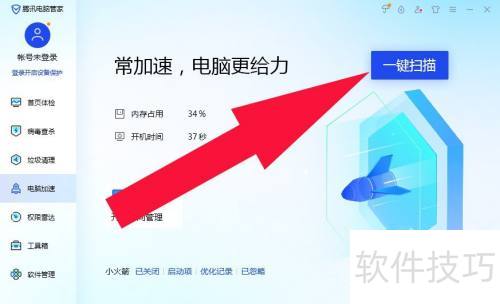 2、 打开电脑加速页面,点击一键扫描,检测需要优化的速度选项。