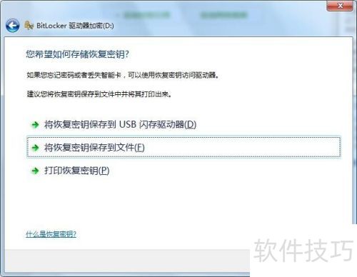 6、 设置解锁密码后,进入下一步,选择恢复密钥存储方式。建议将恢复密钥打印出来,或保存到移动硬盘中以确保安全。