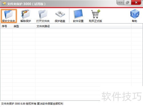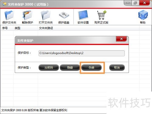 1、 小编使用了一款安全软件,用于保护文件夹中的重要数据。接下来重点介绍如何伪装文件夹。打开软件后,点击主窗口顶部的保护文件夹按钮,选择目标文件夹,然后点击确定即可完成设置。