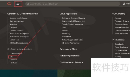 1、 首先,访问甲骨文官网,点击左上角的列表图标,选择其中的Java选项,单击以进入相应页面。