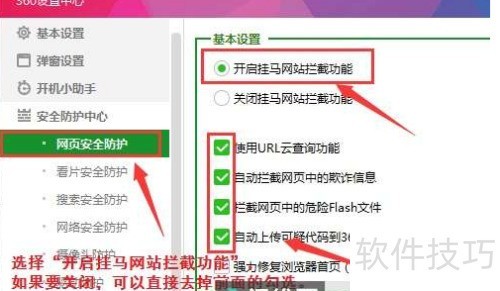 4、 选择开启挂马网站拦截功能,若要关闭某项,直接取消前面的勾选即可。所示: