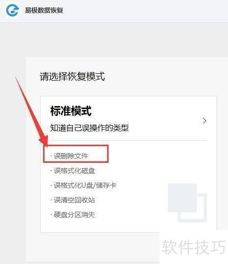 1、 开启易极数据恢复软件,选择误删文件模式,参照下图操作。