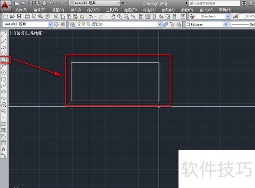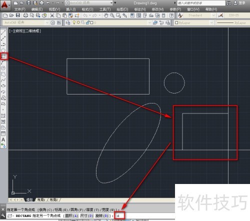 4、 选择矩形工具,命令行输入d,依据尺寸绘制矩形,所示。