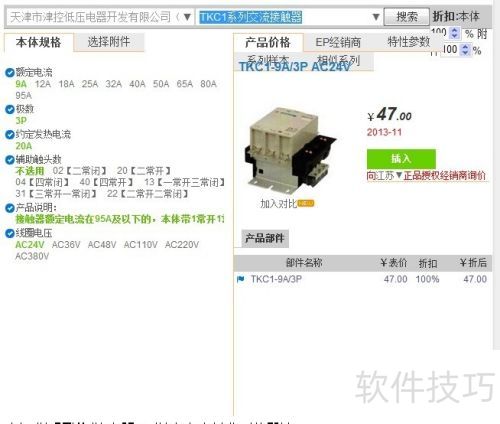 4、 第四,部分电气ERP管理软件在选配元器件时会显示具体价格。软件中的在线元件库可实现这一功能,这是第三种方法。例如,输入C,便会显示相关元器件列表。若选择TKC1系列交流接触器,其详细参数将自动呈现,具体情况可参考下图。