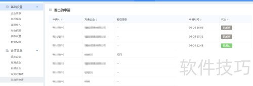 11、 弹窗输入验证信息并发送成功后,可在企业/合作企业/发出的申请中查看记录状态。