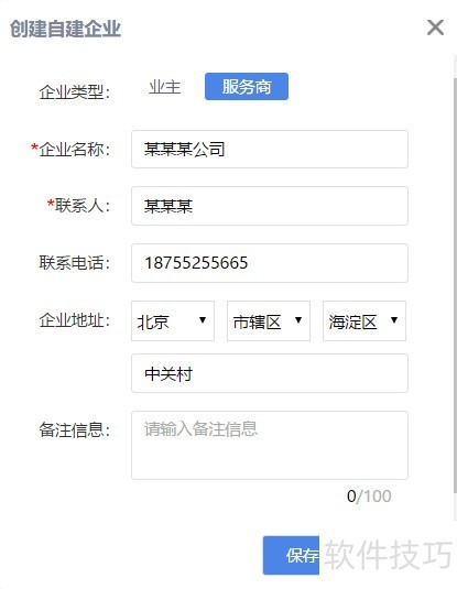 16、 在弹窗里选择自建企业类型(服务商或业主),填写所需信息。之后在工单流程中,可通过选择服务商,完成对其服务情况的统计分析。